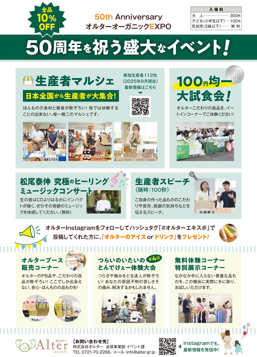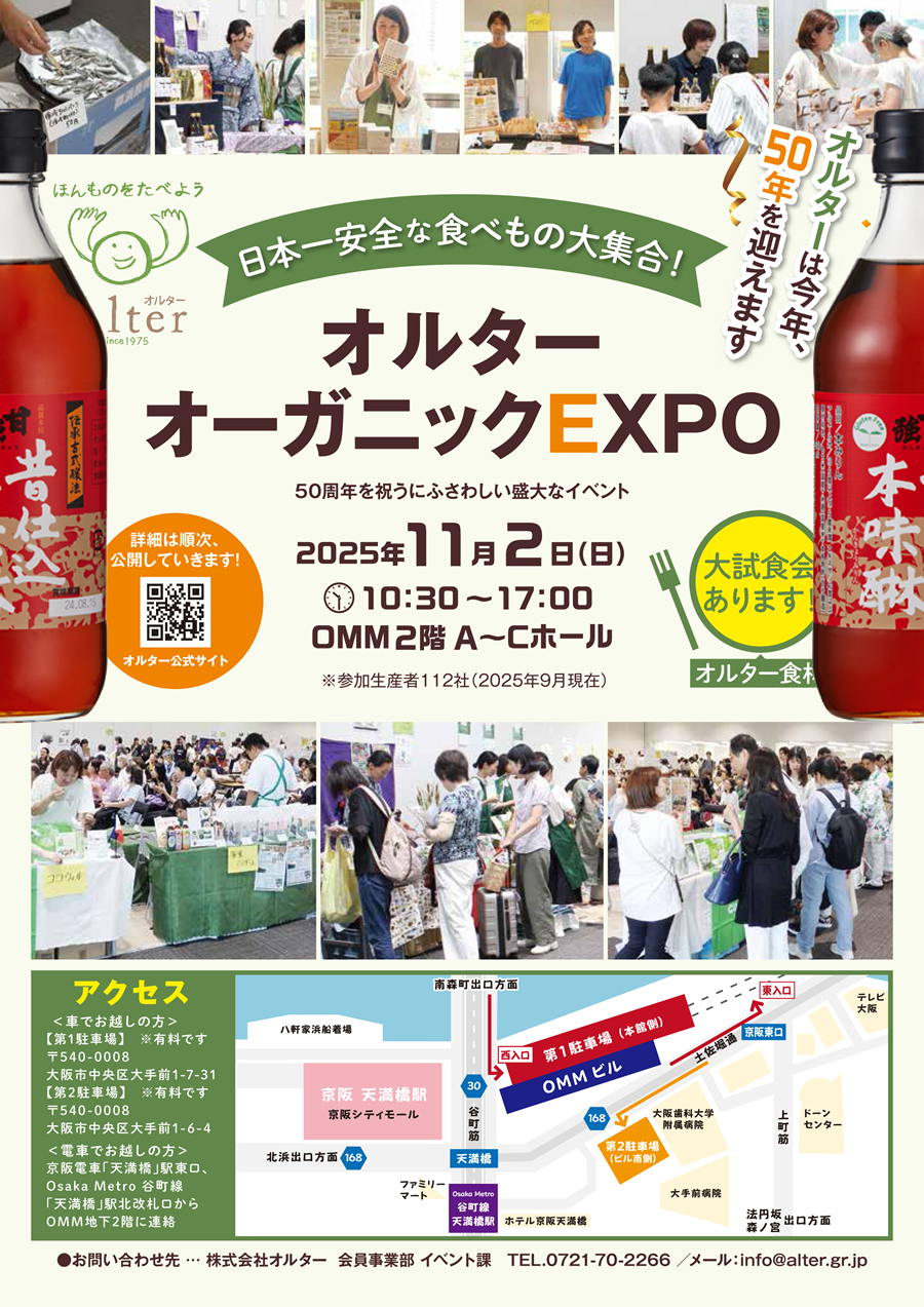 日本一安全な食べもの大集合オルターオーガニックEXPO50周年を祝うにふさわしい盛大なイベント日時:2025年11月2日(日) 1030-1700場所:OMM2階A~Cホール