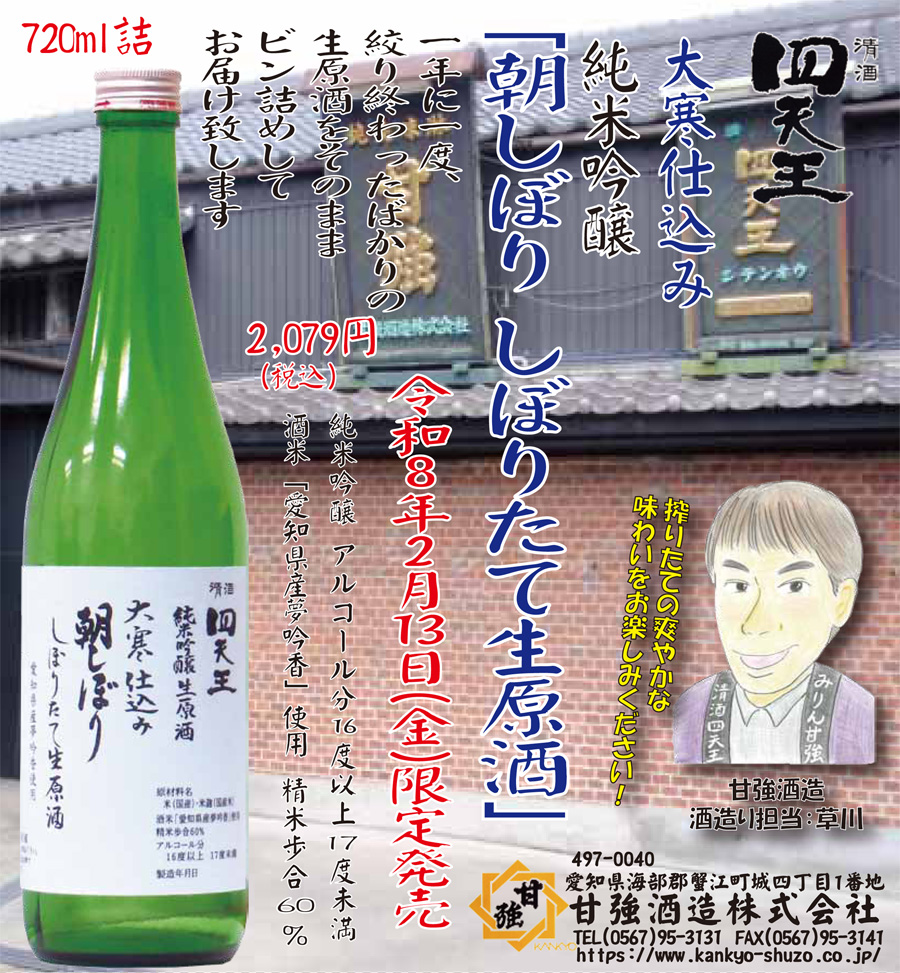 四天王 大寒仕込 純米吟醸「朝しぼり しぼりたて生原酒」令和8年2月13日(金)限定発売一年に一度絞り終わったばかりの生原酒をそのままビン詰めしてお届けいたします720ml詰2,079円アルコール分16度以上17度未満酒米「愛知県産夢吟香」使用精米歩合60%画像をクリックすると通販サイトにジャンプします。ご購入は2本以上でお願いします。【上記画像クリックしますと通販ページにジャンプいたします】
