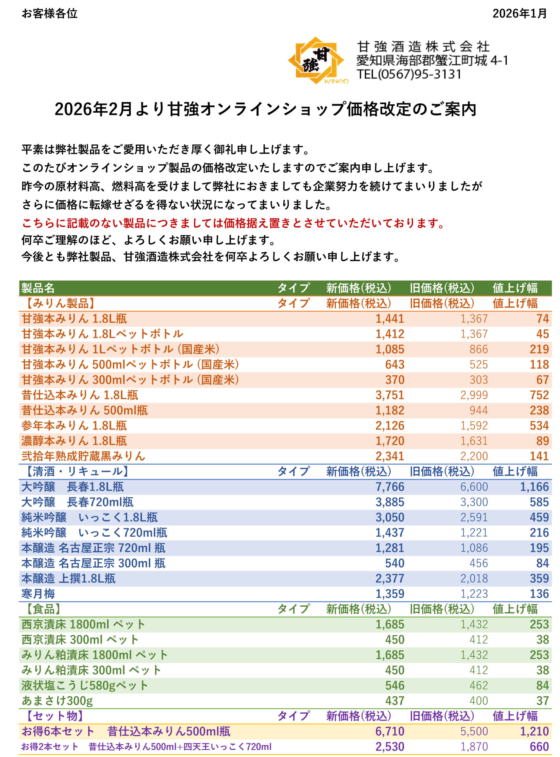 今後とも弊社製品、甘強酒造株式会社を何卒よろしくお願い申し上げます。