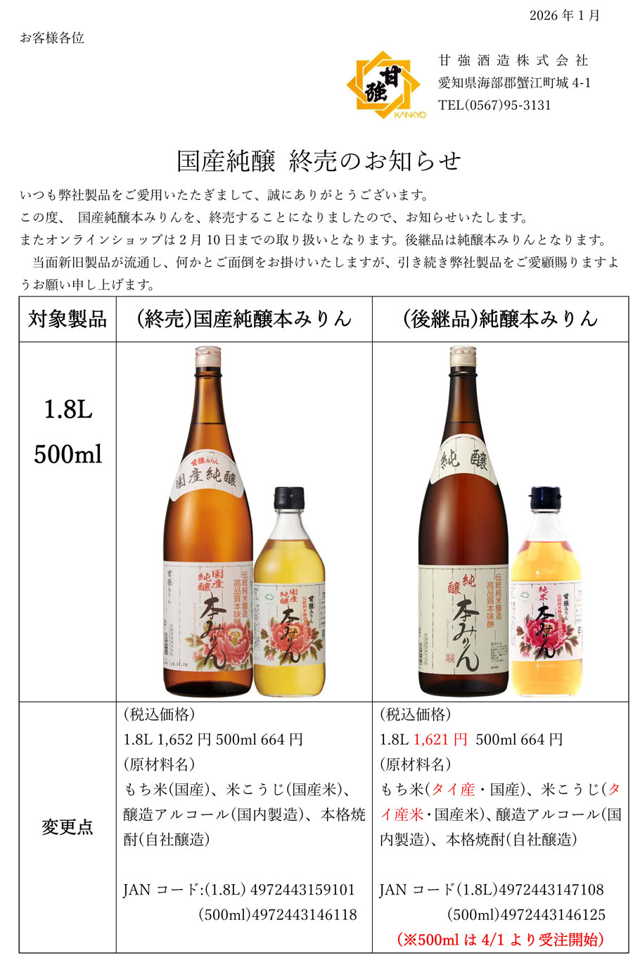 いつも弊社製品をご愛用いたたぎまして、誠にありがとうございます。この度、 国産純醸本みりんを、終売することになりましたので、お知らせいたします。またオンラインショップは2月10日までの取り扱いとなります。後継品は純醸本みりんとなります。 当面新旧製品が流通し、何かとご面倒をお掛けいたしますが、引き続き弊社製品をご愛顧賜りますようお願い申し上げます。