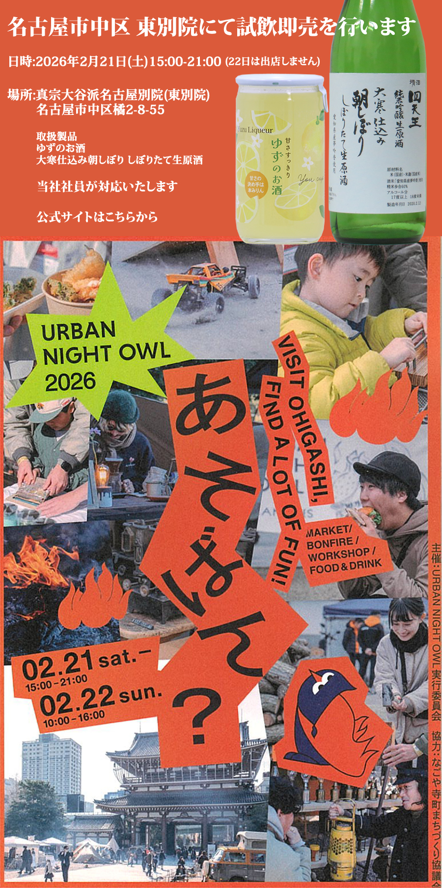 日時:2026年2月21日(土)15:00-21:00(22日は出店しません)場所:真宗大谷派名古屋別院(東別院)名古屋市中区橘2-8-55取扱製品ゆずのお酒大寒仕込み朝しぼり しぼりたて生原酒当社社員が対応いたします