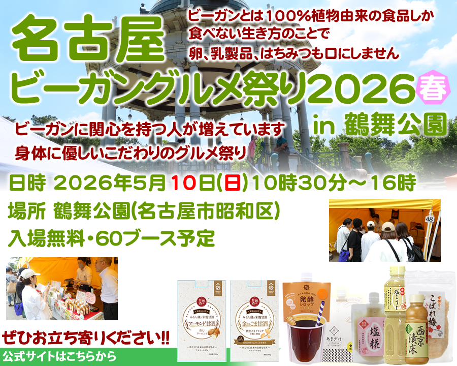 名古屋ビーガングルメ祭り2026春日時 2026年5月10日(日)10時30分~16時場所 鶴舞公園(名古屋市昭和区)入場無料・60ブース予定ぜひお立ち寄りください!!ビーガンとは100%植物由来の食品しか食べない生き方のことで卵、乳製品、はちみつも口にしませんビーガンに関心を持つ人が増えています身体に優しいこだわりのグルメ祭り