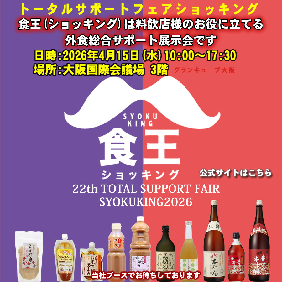 食王(ショッキング)は料飲店様のお役に立てる外食総合サポート展示会です日時:2026年4月15日(水)10:00~17:30場所:大阪国際会議場 3階グランキューブ大阪当社ブースでお待ちしております