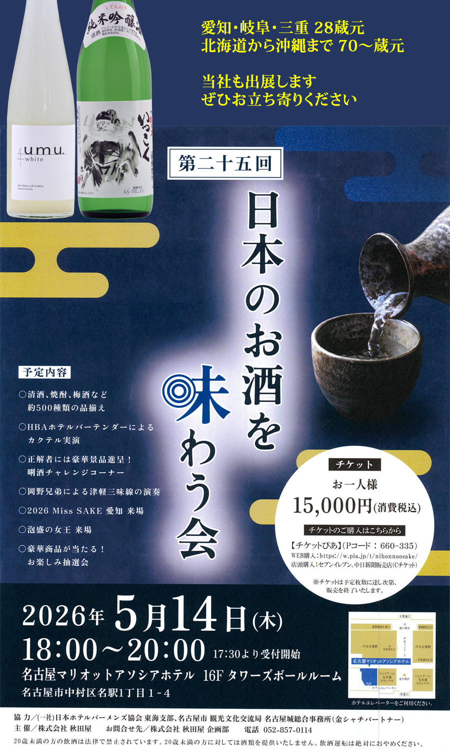 第25回日本のお酒を味わう会日時 2026年5月14日(木)18:00-20:00 17:30受付開始場所 名古屋マリオットアソシアホテル 16Fタワーズボールルーム 名古屋市中村区名駅1丁目1-4チケット制 お一人様15,000円(消費税込)チケットピア Pコード : 660-335